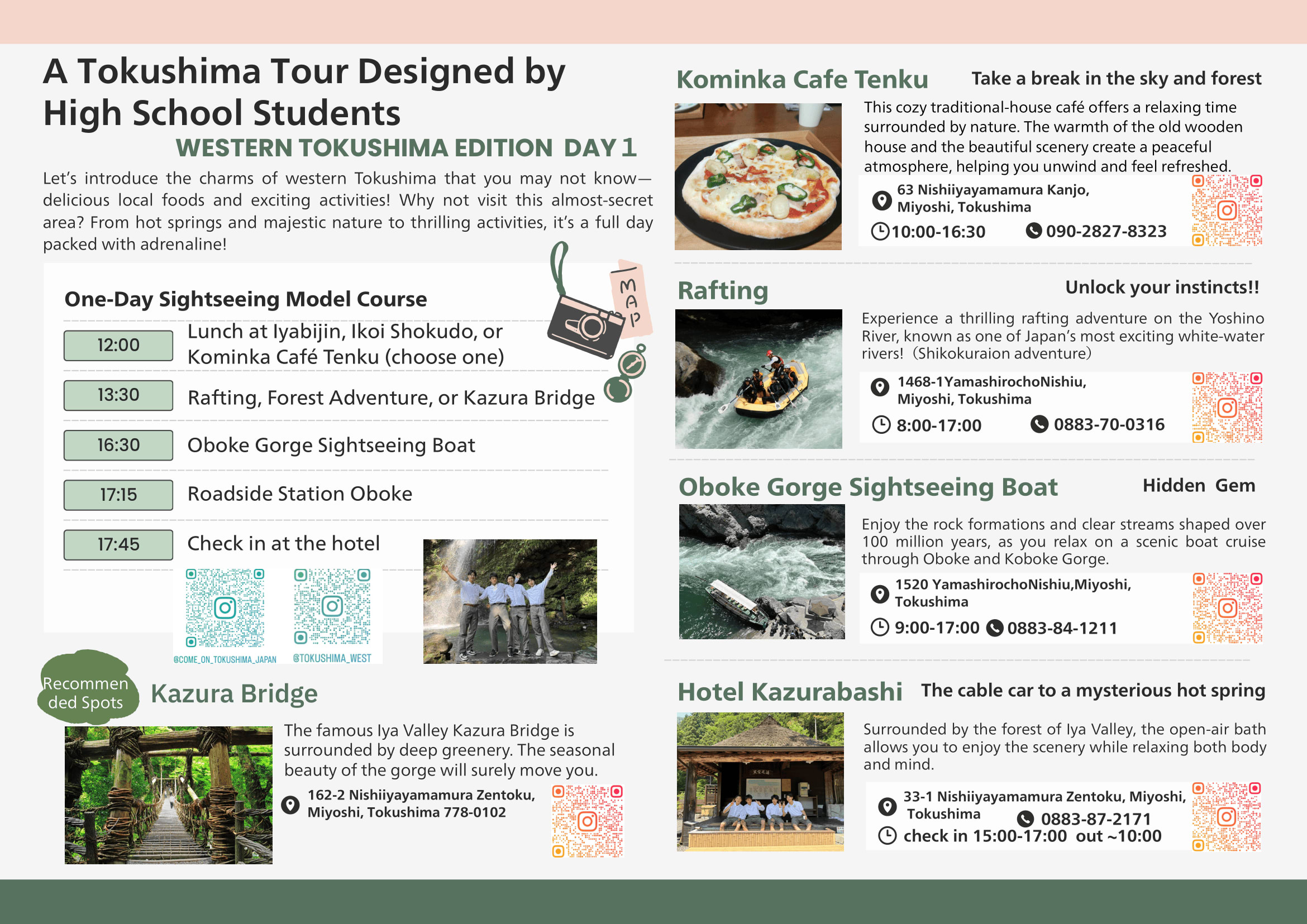 Let’s introduce the charms of western Tokushima that you may not know— delicious local foods and exciting activities! Why not visit this almost-secret area? From hot springs and majestic nature to thrilling activities, it’s a full day packed with adrenaline!
